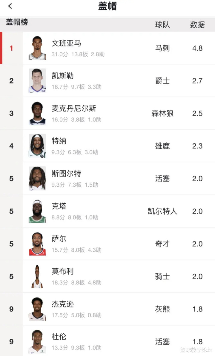 开季至今,文班亚马打了4场比赛,一共送出19记盖帽。场均4.75记盖帽,高居联盟第一。联盟第二是凯斯勒(2.7记盖帽),第三是麦克丹尼尔斯(2.5记盖帽)。文班亚马绝对是遥遥领先,没有人能撼动他盖帽王的位置。